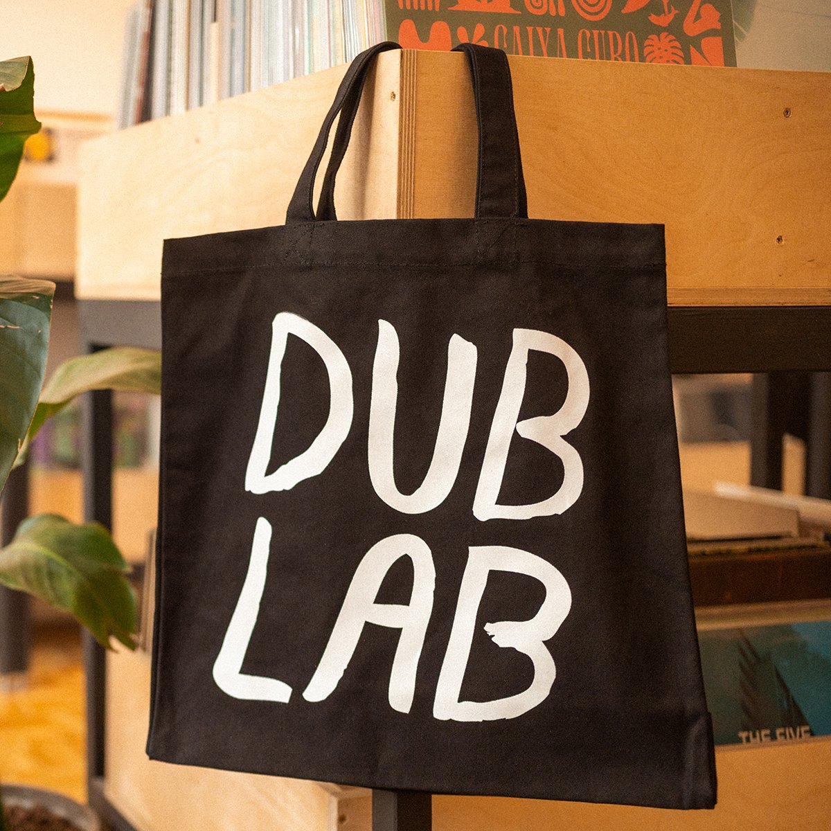 Black shoulderbag with white dublab Sumi-Ink Club logo print on both sides. Made of 100% strong fairtrade cotton, super sturdy. Perfect for recordshopping; holds 40+ records.